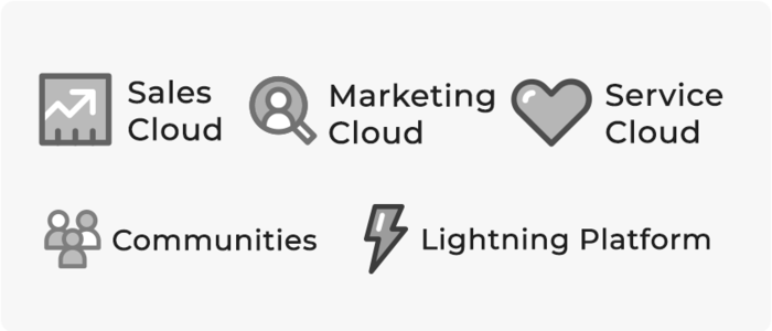 Sales Cloud, Service Cloud, Communities, Field Service Lightning Marketing Cloud, Mulesoft, Heroku
